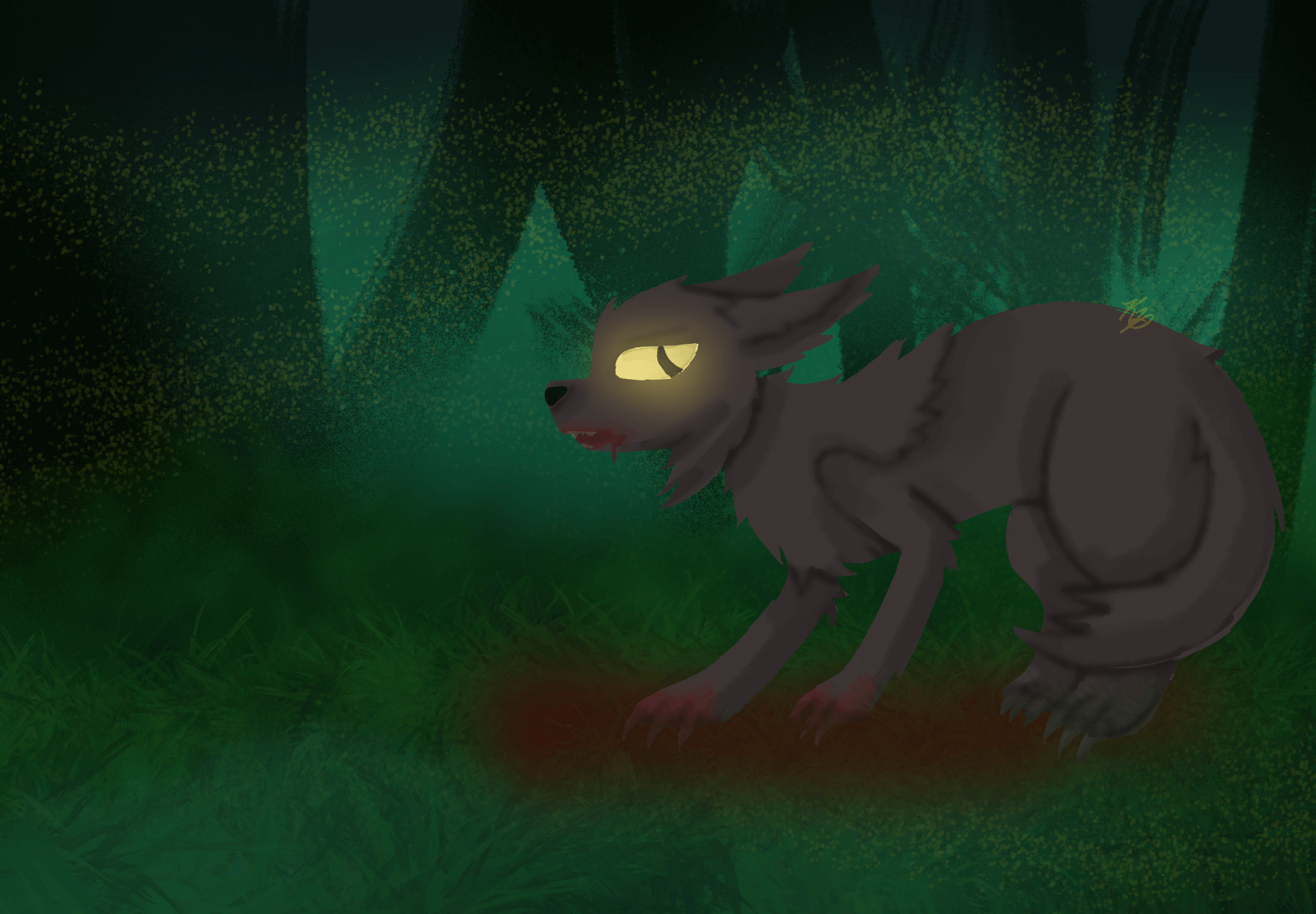 The moon was bright, although the clouds seemed to dim the sky around them. Robbyn seemed to be staying extra close to them, Krys thought. Suddenly Krys tripped over one of the younger Ribinas. Landing flat on the ground, Krys noticed something through a nearby bush. It looked like a Ribina but something was off. Aurelia seemed extra protective as Krys squinted into the darkness. This strange creature seemed almost rabid. Something dripped onto the ground as it twitched and jerked its head at any slight noise. Their coat seemed more rough, and their claws were a lot longer than they had ever seen before. More than just a simple mutation.
